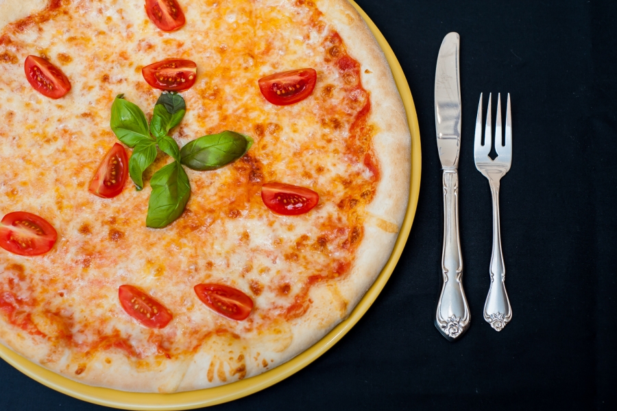 Dough, pizza sauce, mozzarella cheese, cherry tomatoes, fresh basil.
