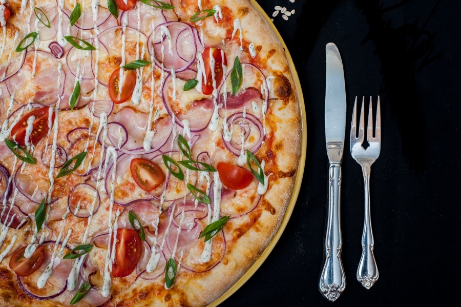 Dough, pizza sauce, mozzarella cheese, bacon, red onions, tomatoes, fresh onions (scallion), garlic sauce.