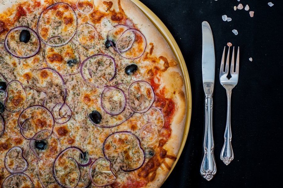 Dough, pizza sauce, mozzarella cheese, tuna, red onion, olives, dill.