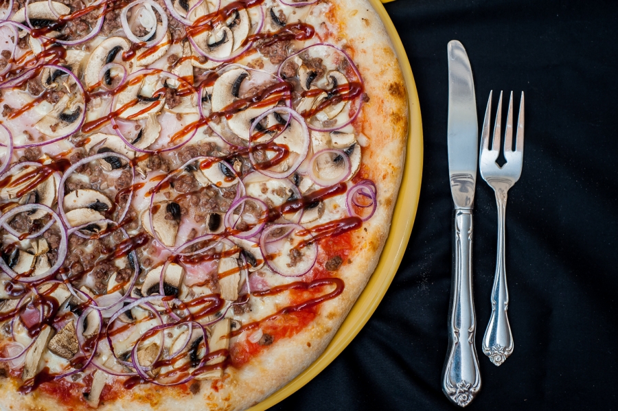 Dough, pizza sauce, mozzarella cheese, bacon, minced beef, champignons, fried onions, barbecue sauce. 8.50 Eur 22cm 13.00 Eur 32cm