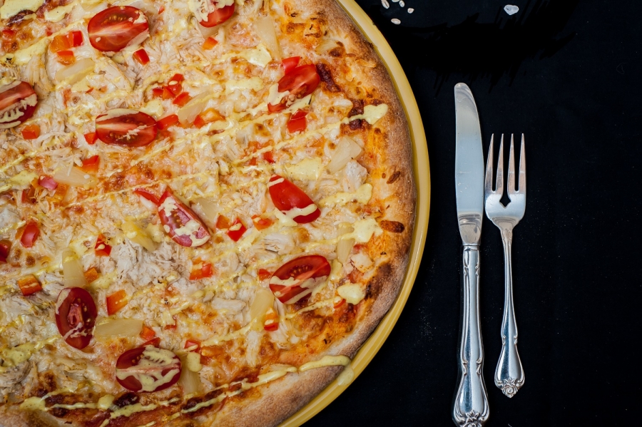 Picas mīkla, picas mērce, siers mozzarella, vistas fileja, paprika, tomāti, ananāsi, karija mērce. 8.50 Eur 22cm 12.70 Eur 32cm